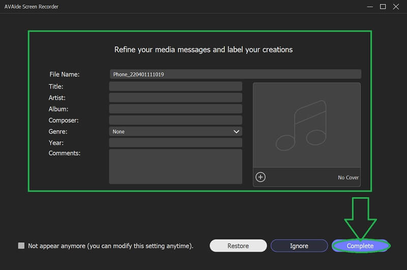 ステップ5録音を停止すると、エクスポートが始まります。新しい画面が表示されます。よりきれいな結果にしたい場合は、音声をトリミングできます。完了したら、 輸出ファイルにラベルを付けて整理することもできます。 完了 すべてを終わらせる。