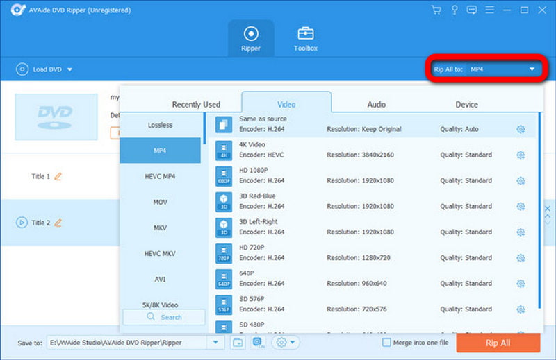 Step 3Once the DVD is loaded, go to Rip All to drop down in the top-right corner of the screen. Please select the required format or MP4 here since you want it for a tablet.